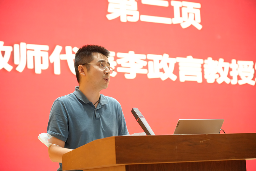 李政言教授作为教师代表致辞。他从过来人的角度为新生分享了三点经验:第一,明确学习意义。大学作为跑人生马拉松的重要一站,要敢于迈出步子向前走,然后提醒自己:慢慢来,比较快。第二,确定学习方向。在“低头拉车”时更要“抬头看路”,根据自己的理想、性格等因素选择一条适合自己的发展道路。第三,掌握学习方法。学习应该使人在付出后有收获感而非焦虑感,希望大家在对学习形成正确认识后养成良好的学习习惯,学会学习、终身学习。