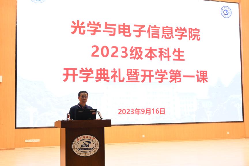秋高气爽,金风习习。9月16日下午,光电信息学院2023级本科生开学典礼在光电信息大楼C118报告厅隆重举行。学院党委书记张涛,院长唐江,党委副书记、副院长张敏明,学院副院长聂明局,学院工会主席唐霞辉,本科2023级教师班主任,研究生班主任代表,年级辅导员以及光电信息学院本科2023级全体新生参加本次开学典礼。典礼由学院党委委员、副院长聂明局主持。