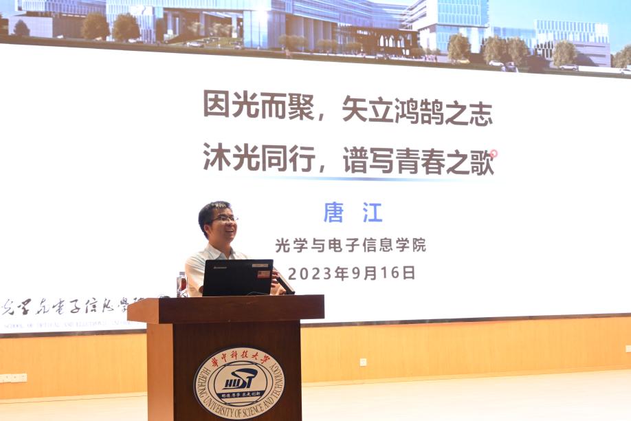 开学典礼后,学院院长唐江老师以“因光而聚,矢立鸿鹄之志;沐光同行,谱写青春之歌”为题,从“光电学科、光电学院、光电学子”三个角度为2023级本科新生们讲授开学第一课。他从“光”“电”是什么讲起,引导同学们认识光电学科是什么、光电专业学什么以及光电产业未来发展前景如何,引导同学们弘扬“独树一帜”精神,深耕光电领域,勇攀科技自立自强高峰。而后,他从光电学院50余年的建设发展历史出发,向同学们介绍了学院的师资队伍、科研平台、课程实践体系以及学院能够给大家提供的保障和支持,让同学们从各个方面了解“大光电、强光电、名光电”的内涵。最后唐江院长从“室友”和“朋友”这两类最亲密的“友人”讲起,嘱托大家营造和谐宿舍关系、形成奋进的学习氛围、养成良好的生活习惯,一起守护集体的“荣耀”。他鼓励同学们在与朋友交往的过程中一起追寻生活的意义,在大学期间收获受益终身的友谊。
