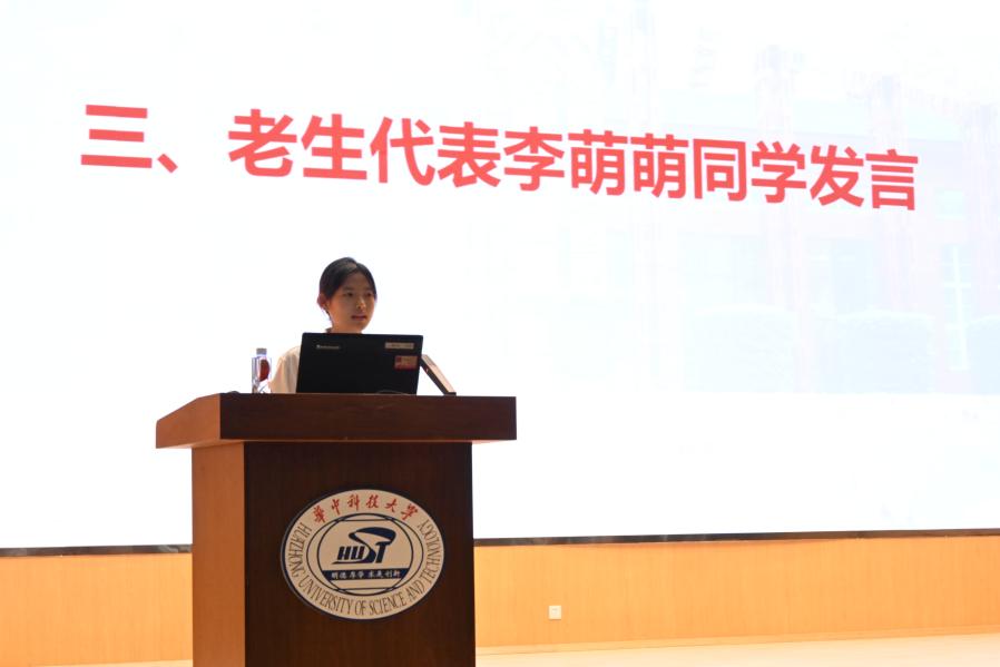 老生代表2020级本科生、院学生会主席团成员李萌萌同学发言。回顾大学生活,她向同学们提出三点倡议。第一,要当信仰坚定、知行合一的光电人。从最开始期末周、光赛、大创前的迷茫,到不懈努力后收获的累累硕果,她的学习生活经历向学弟学妹们诠释了“行之力则知愈进,知之深则行愈达”的内涵。第二,要做会自我欣赏、相信自己的光电人。多种多样的大学生活是青春的写照,要勇敢尝试,从容不迫地向前迈进。第三,要成为保持热爱、勇于奔赴下一场山海的光电人,相信“少年不惧岁月长,彼方尚有荣光在”,坚定“功不唐捐,玉汝于成”的信念。
