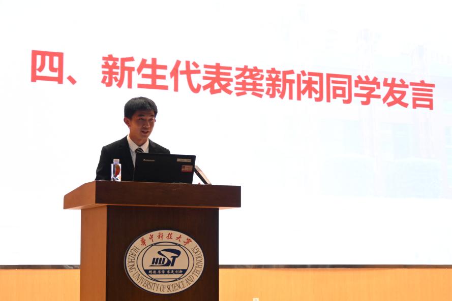新生代表、“光芒”新生骨干培训班班长龚新闲同学发言。他从刚刚结束的军训生活切入,回忆起军训过程的一点一滴,他呼吁大家把军训时的“飒气”延续到即将开始的大学学习生活中,并希望相处四年的同学们继续像“战友”一样团结在一起,心往一处想,劲往一处使,怀揣“不破楼兰终不还”和“雄关漫道真如铁”的精神共创光电信息学院新的辉煌。