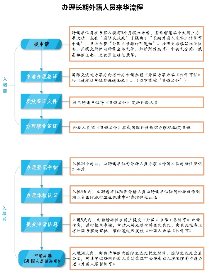 1.外籍人员来校工作前90天以上,需由聘请单位在网上提交《外国人来华工作许可通知》申请信息,进行校内审核,申请人将纸质材料提交威廉希尔处,由威廉希尔处报湖北省外国专家局审批,审批通过后发放电子版《外国人来华工作许可通知》,由聘请单位发送给国外专家、学者、外籍人员。