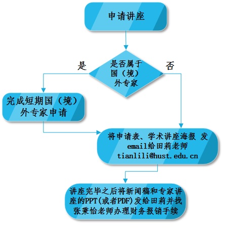 1)讲座信息(光电信息大讲堂申请表、学术讲座PPT,模版见附件)请提前一周发email给刘田昕老师liutianxin@hust.edu.cn以便安排。由分管院领导审批,审核报告题目。请在外国专家(或者在国外工作的中国人)来访之前一定要进行短期外国专家来访申请登记(流程见:https://ehall.hust.edu.cn/infoplus/form/DQLFSQ/start)