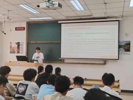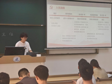 紧接着,屈永祥向大家详细介绍了光电本硕博本科生党支部的情况,并从组织生活、理论学习、社会实践和党员作风等维度,全面展示了学生党支部和学生党员的日常工作内容。在入党教育环节,屈永祥向同学们解读了“申请入党—积极分子培养—发展对象考察—预备党员教育—正式入党”的完整入党流程,并结合学院的党员发展标准和党支部发展对象推选流程,勉励同学们始终坚持理论学习不放松,在志愿服务、学生工作、服务群众等各个方面严格要求自己,积极向党组织靠拢。