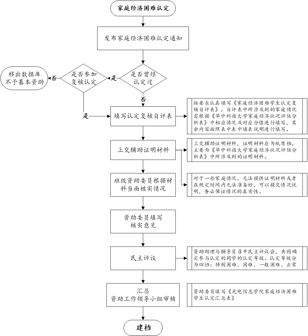 家庭经济困难认定是我校推进精准资助工作,改进并完善各类精准帮扶措施,全面了解学生家庭经济情况的重要举措。家庭经济困难认定每年10月份开展一次,认定结果作为评奖、评助的重要参考依据。认定流程: