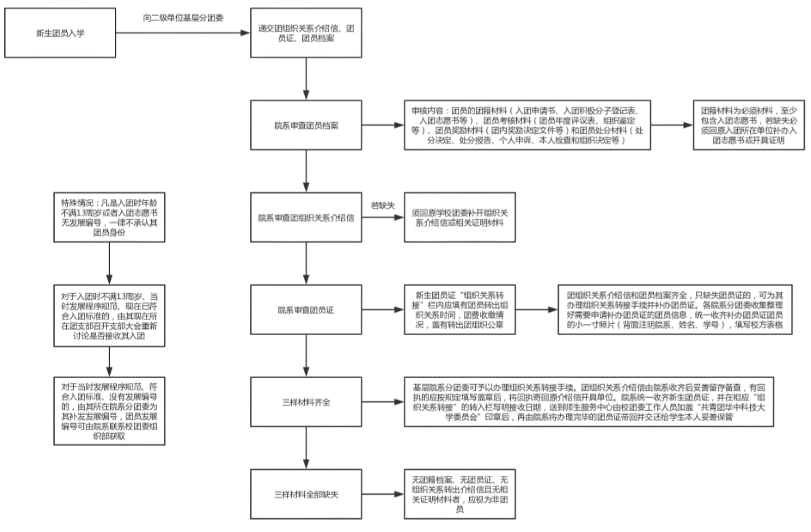 (1)凡具有我校学籍的全日制本科生、硕士研究生、博士研究生新生团员入学后,应向学院分团委递交团组织关系介绍信、团员证,及时办理组织关系转接手续。新生团组织关系转接主要着手于两个方向、三项材料的转接工作。两个方向是线上智慧团建的团籍转入和线下团籍材料的交接,三项材料即团组织关系介绍信、团员证和团员档案。