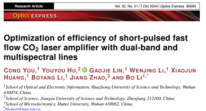 近日,光电信息学院李波课题组在面向极紫外光刻光源的短脉冲CO2激光高效放大领域取得重要进展。该团队的研究论文“Optimization of efficiency of short-pulsed fast flow CO2laser amplifier with dual-band and multispectral lines”在国际知名光学期刊《Optics Express》上发表。硕士生游聪为第一作者,william威廉中文为论文第一完成单位。