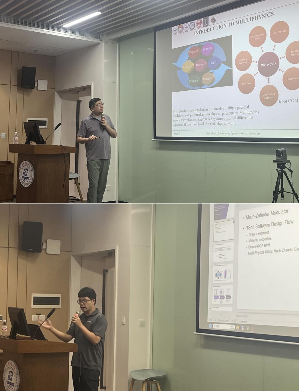 15日上午,浙江大学沙威教授深入解读“多物理系统”,介绍与Maxwell方程耦合的多物理场作用机制,并阐述基于守恒律的多物理仿真验证方法,为复杂光学系统设计提供理论支撑。新思科技陈钧顺带来Rsoft软件实操,指导学员完成光电子调制器的结构设计与性能仿真,涵盖材料属性设置、BeamPROP BPM仿真等关键步骤。