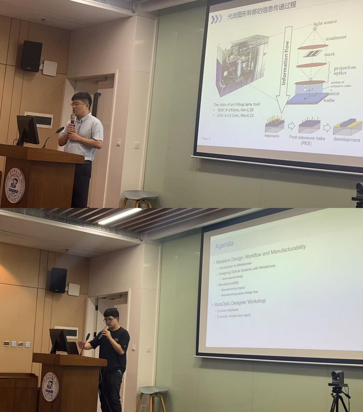16日上午,中国科学院上海光学精密机械研究所李思坤研究员从“光刻信息传递过程”切入,以“光源-掩模-投影光学-光刻胶-晶圆”的链条为脉络,梳理光刻仿真的发展历程,并介绍DUV(193nm)、EUV(13.5nm)等主流光刻技术的应用场景。新思科技陈钧顺在仿真课程前补充讲解Metalens(超构透镜)技术及仿真实验流程,引导学员通过实操理解光刻技术对超构透镜的影响。
